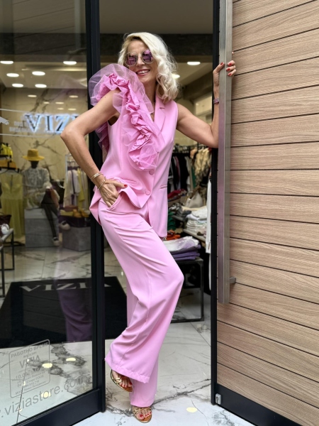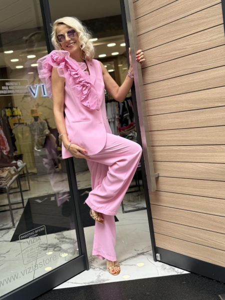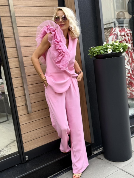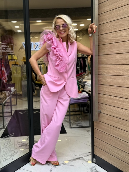 Комплект елек с панталон в наситено розово. Елекът е със свободна кройка и интересна декорация на едното рамо. Панталонът е с широки крачоли, ластик на талията и закопчаване с копче.