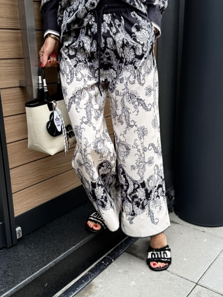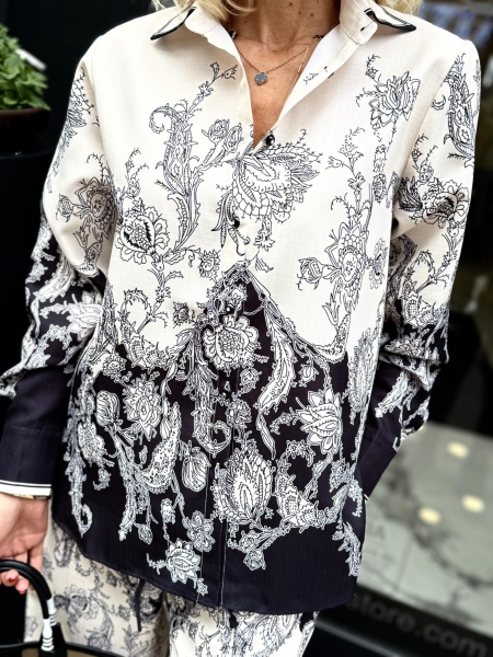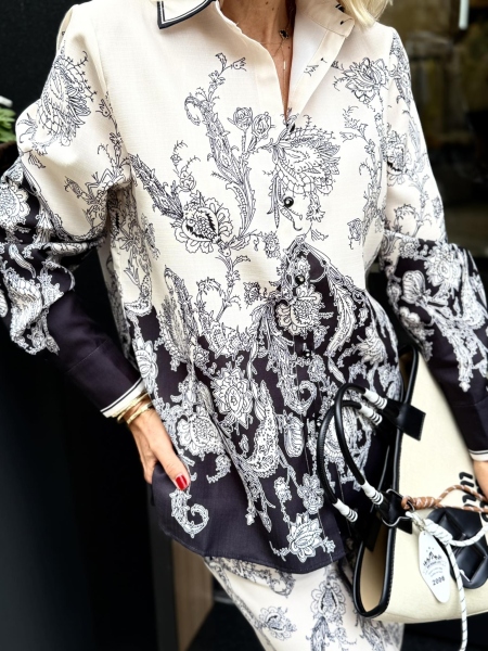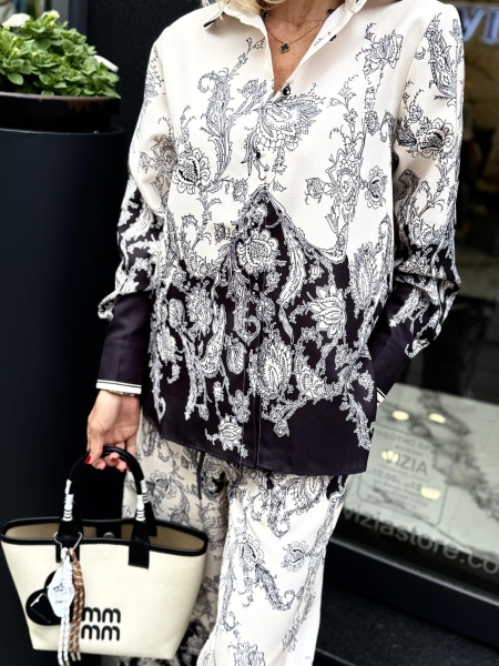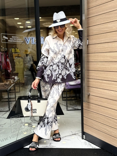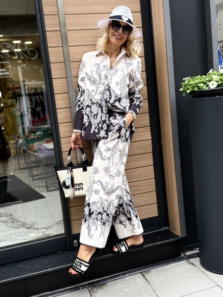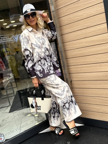 Комплект риза и панталон с десен в екрю и черно. Ризата е със свободна кройка. Панталонът е с ластик на талията и широки крачоли.