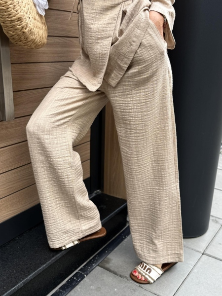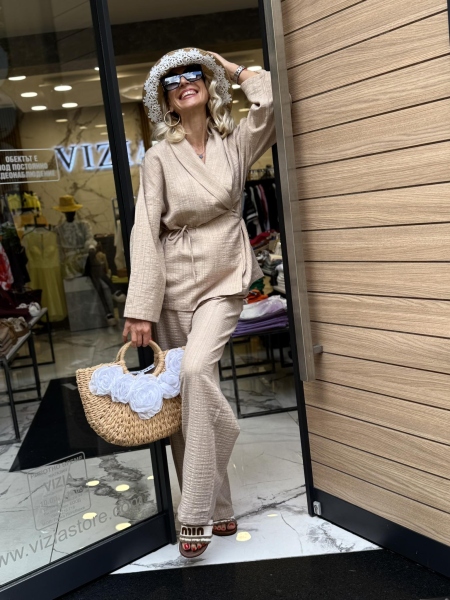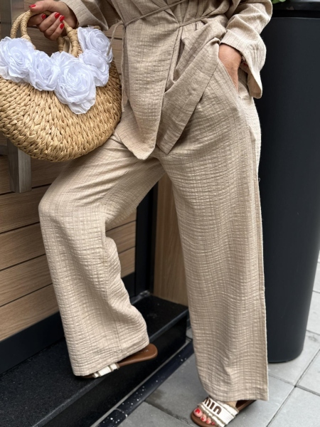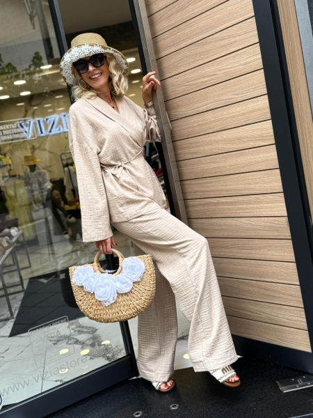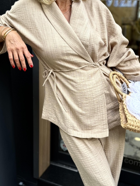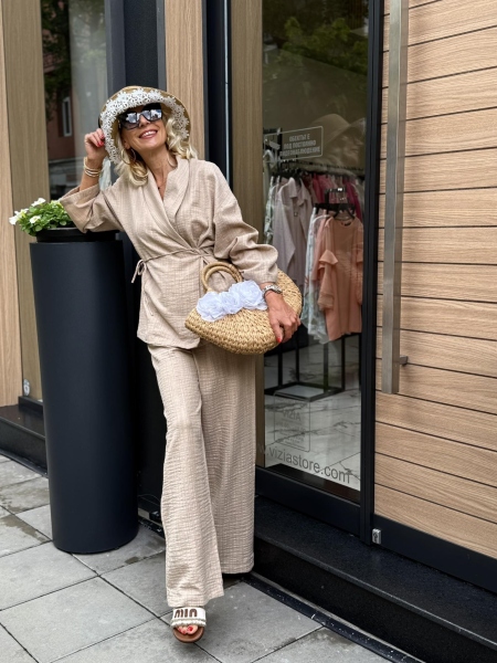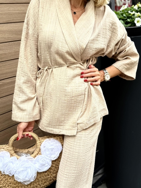 Комплект риза с панталон от фина материя в бежов цвят. Горната част е тип кимоно с широки ръкави и се завързва само с връзка. Панталонът е с ластик на талията и широки крачоли.