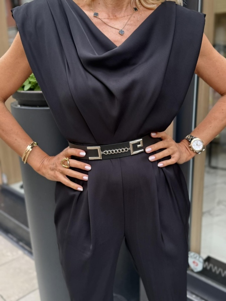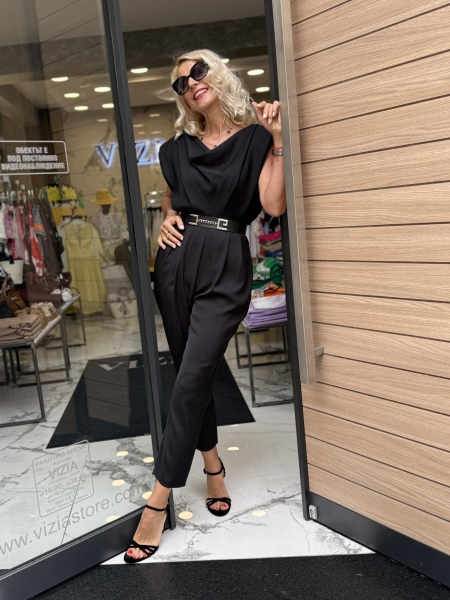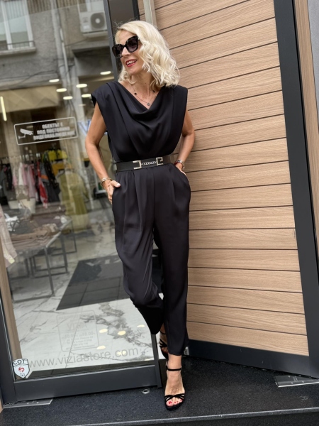 Гащеризон в черен цвят с подплънки на раменете, втален силует и басти на панталонът. Моделът се закопчава с цип. Към него има аксесоар колан.