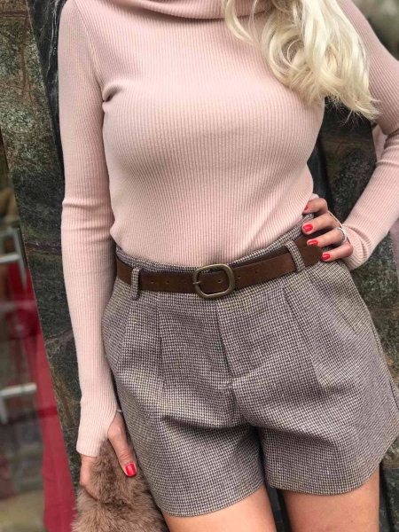 Къси панталони от плътна материя с подплата.Модела се закопчава с цип и копче,има и странични джобове.Към тях има и колан.