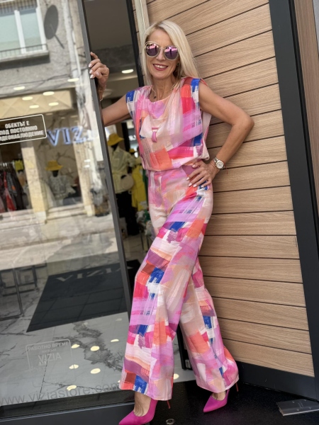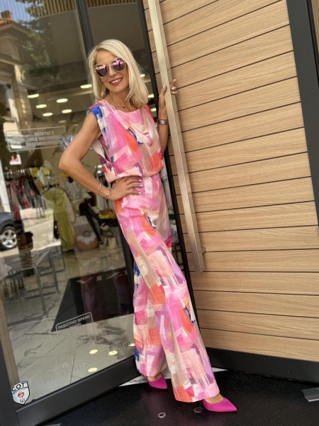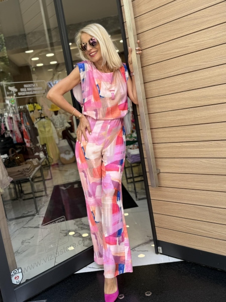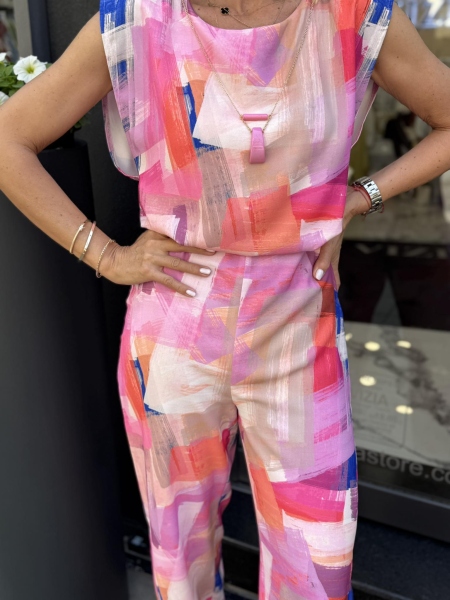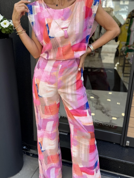 Гащеризон с широки крачоли в цветен десен. Моделът се закопчава с цип.