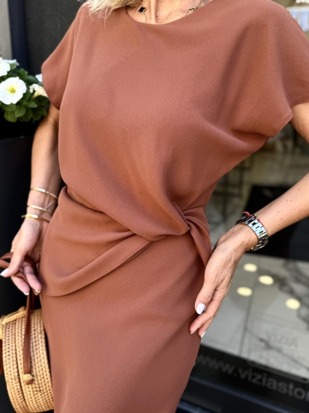 Рокля от тънка материя с миди дължина в кафяв цвят. Моделът е с шев на талията и се закопчава с цип.