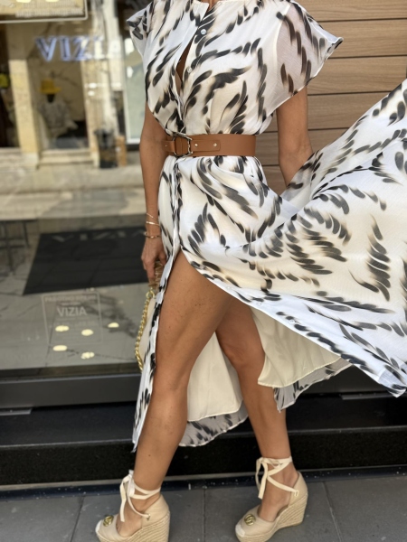 Рокля с миди дължина от фина и лека матери. Моделът се закопчава с копчета има подплата и колан за талията.