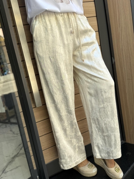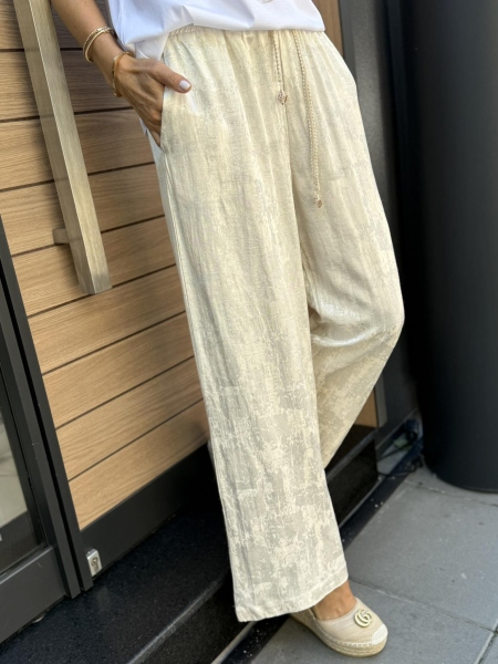 Панталон в перлен цвят от мека материя. Моделът е с ластик на талията и широки крачоли.