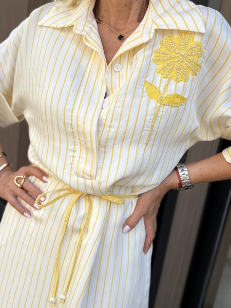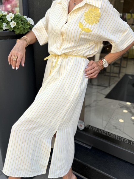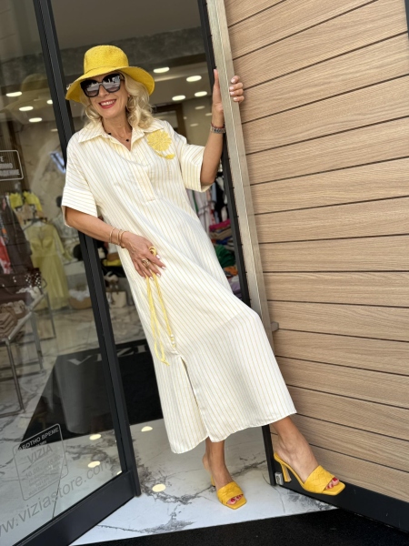 Дълга рокля в бяло и жълто със свободна кройка. Моделът е с 3/4 ръкав, облича се без закопчаване и има тънко коланче за вталяване.