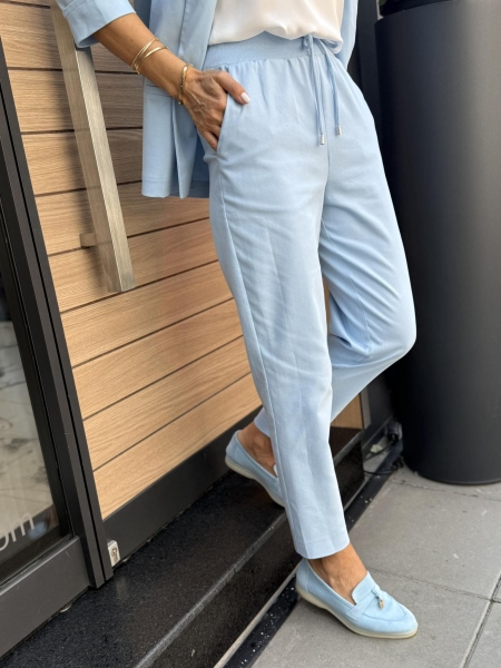 Спортно- елегантен комплект сако и панталон в светло син цвят. Сакото е със свободна кройка без закопчаване. Панталонът е със стесняващи се крачоли и ластик на талията.
