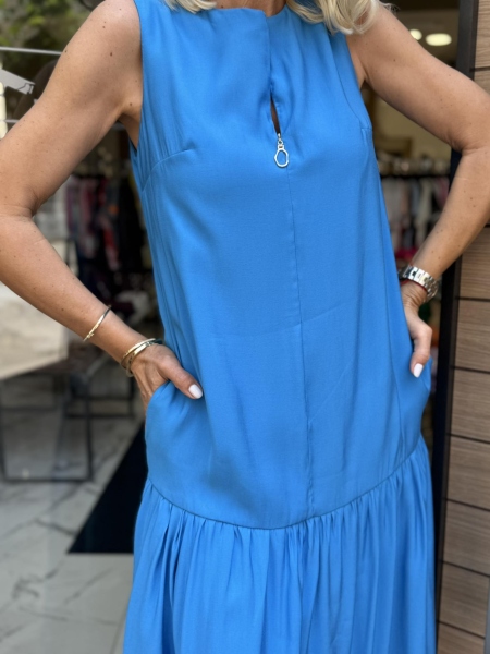 Дълга рокля със свободна кройка от фин плат. Моделът има само цип в предната част.