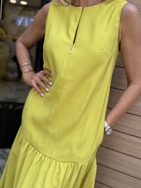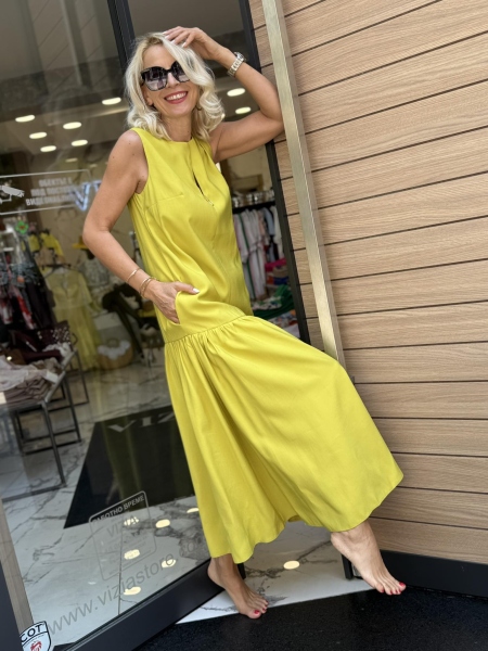 Дълга рокля със свободна кройка от фин плат. Моделът има само цип в предната част.