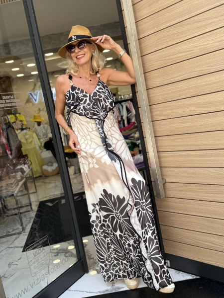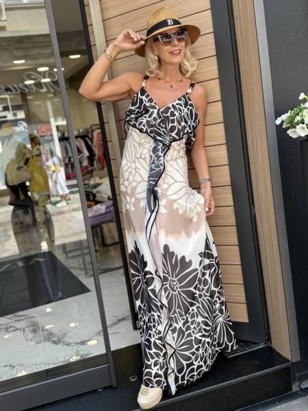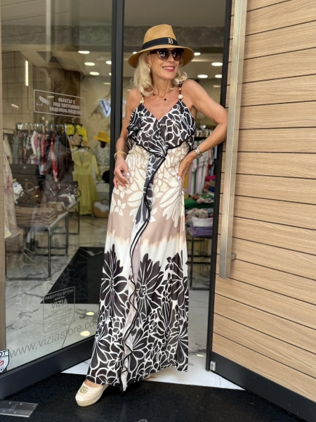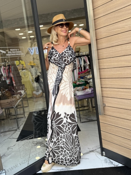 Дълга рокля от шифонена материя с летен десен. Моделът е с тънки презрамки и се закопчава с цип.