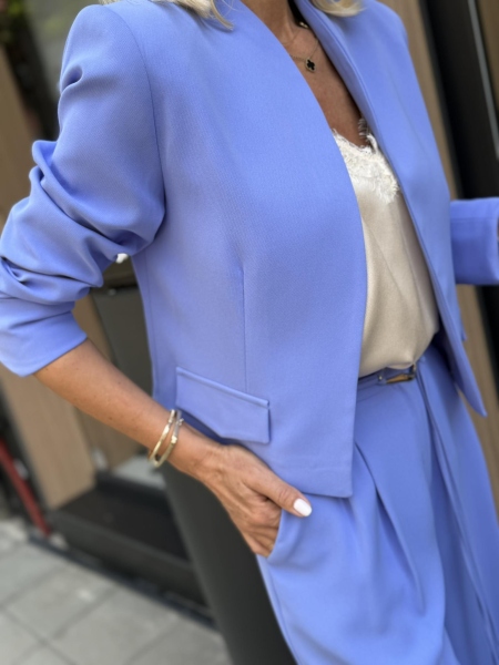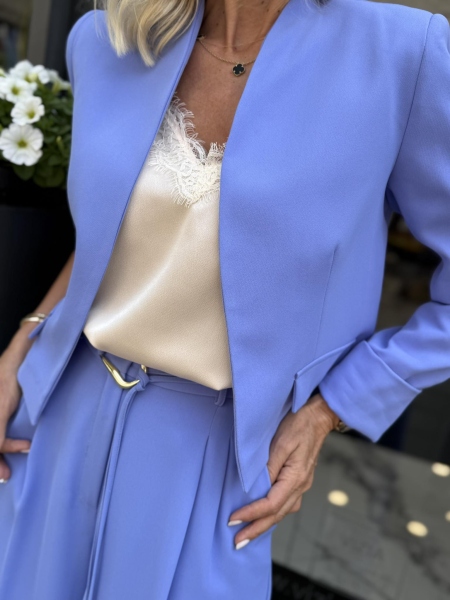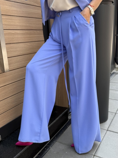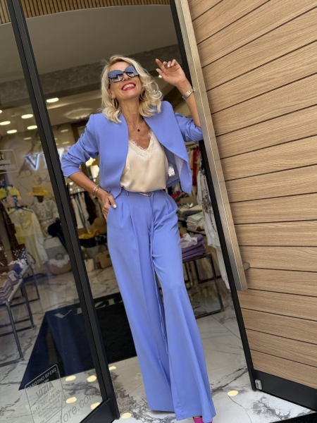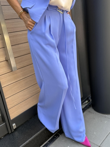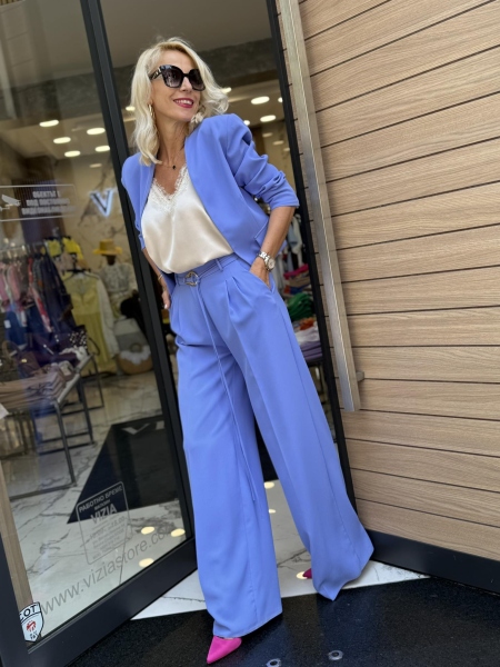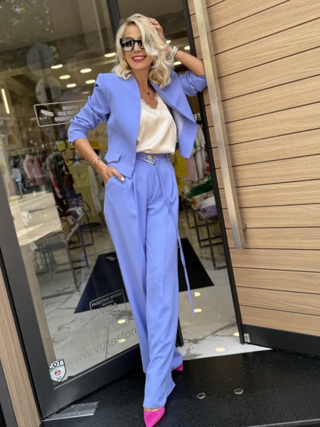 Комплект сако и панталон в лилав цвят с изчистен дизайн. Сакото е къс модел без закопчаване. Панталонът е с широки крачоли, басти и ластик на талията. Към него има и колан.