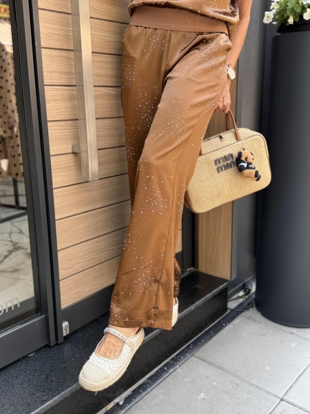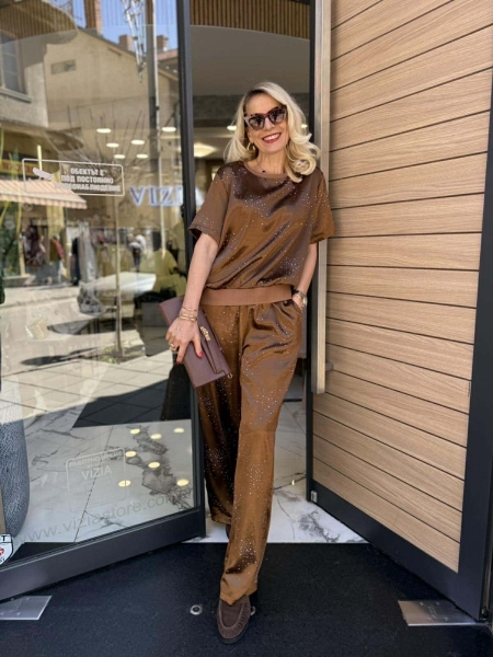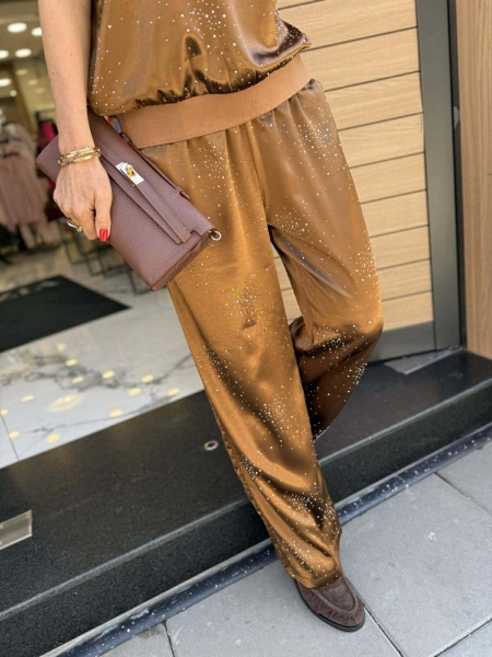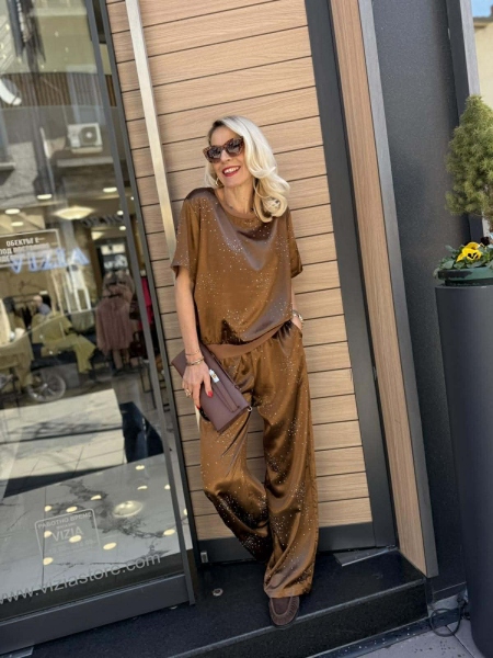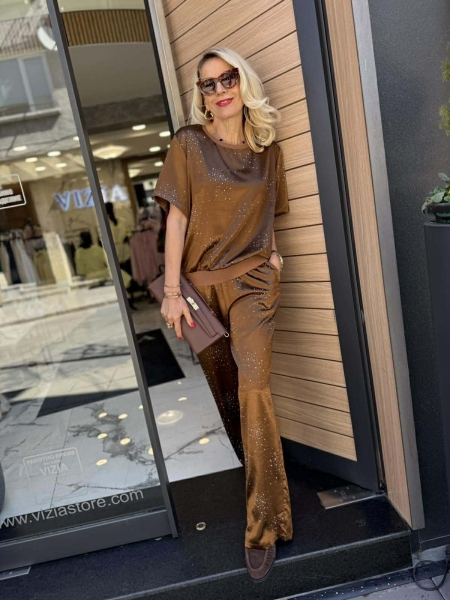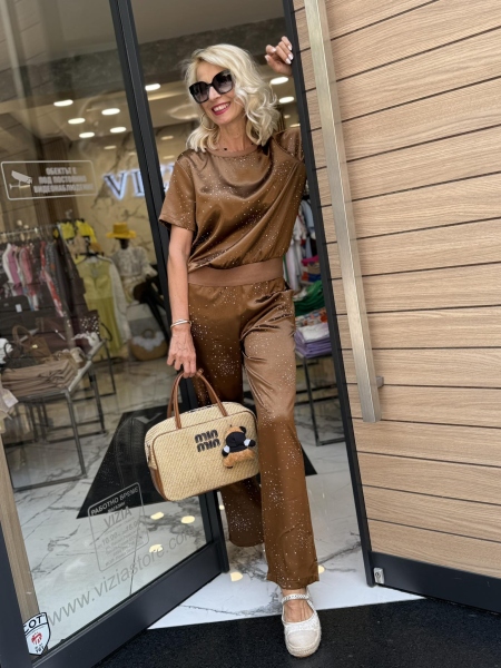 Комплект блуза с панталон от сатенирана материя с декорация от камъчета. Блузата е свободна с ластик на ръкавите и талията. Панталонът е с прави крачоли и ластик на талията.