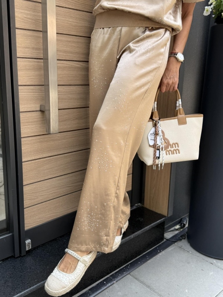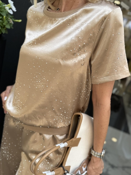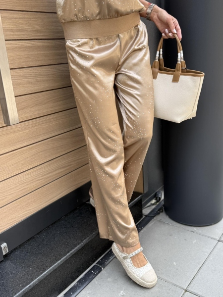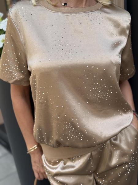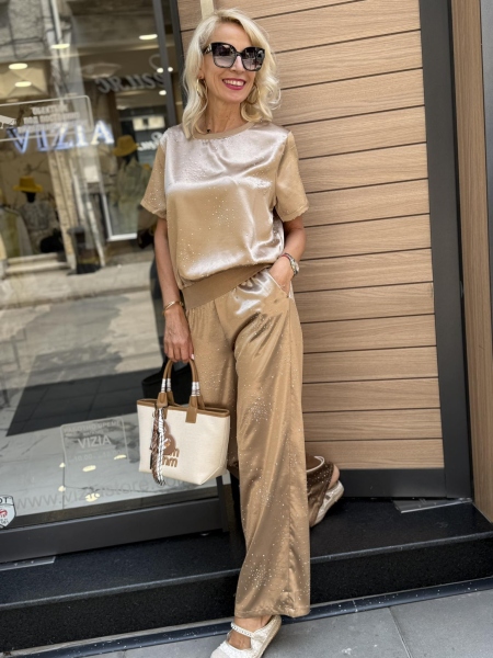 Комплект блуза с панталон от сатенирана материя с декорация от камъчета. Блузата е свободна с ластик на ръкавите и талията. Панталонът е с прави крачоли и ластик на талията.