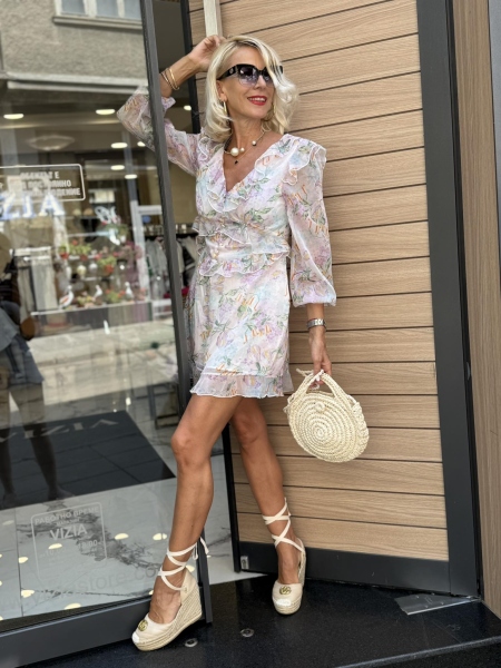 Гащеризон с къси панталони от шифонена материя с цветен десен. Моделът е втален и се закопчава с цип.