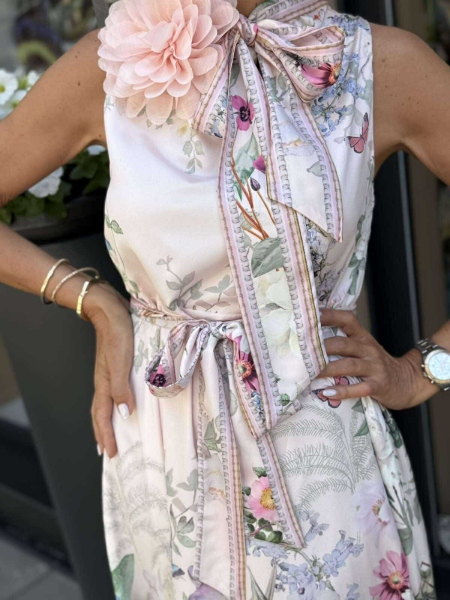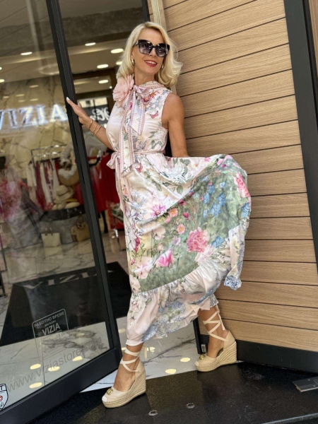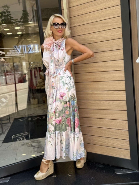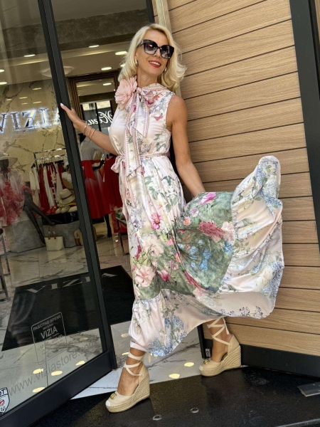 Дълга рокля в розов цвят с флорален десен. Моделът със свободна кройка, без закопчаване и има тънко коланче за талията.
