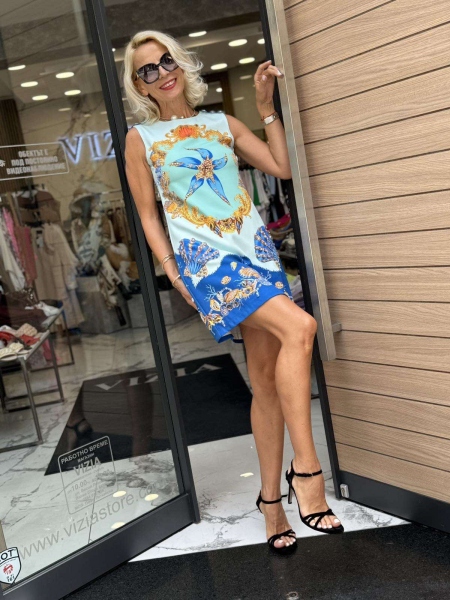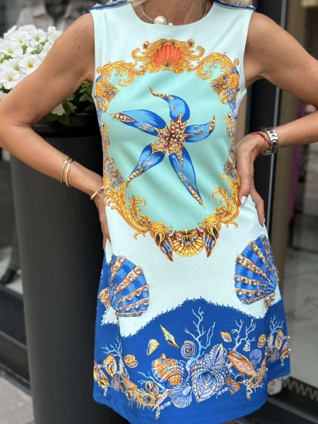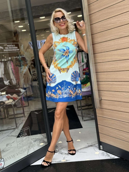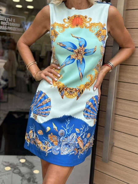 Рокля с трапецовидна кройка в сини нюанси с декорация от камъчета. Моделът се закопчава с цип.