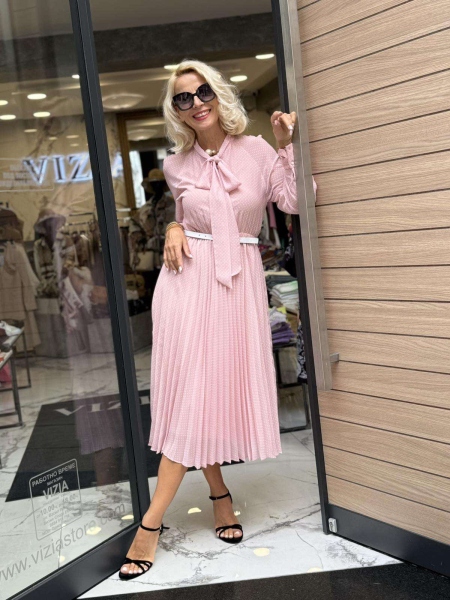 Рокля с миди дължина в розов цвят на бели точки. Моделът е с ластик на талията и копчета на бюста Към нея има аксесоар колан.