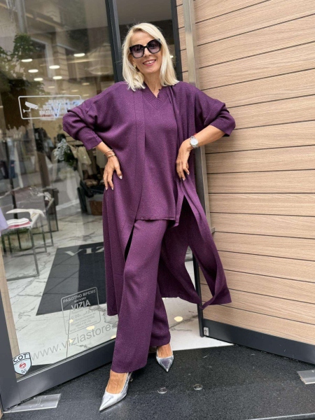Комплект три части в лилав цвят от фино плетиво с ламе. Жилетката е дълга, свободна и не се закопчава. Блузата е свободна с къс ръкав. Панталонът е с ластик на талията и свободни крачоли.