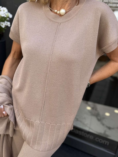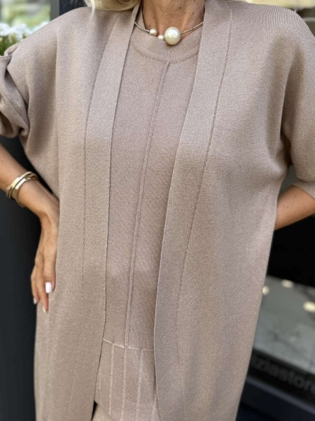 Комплект три части в бежов цвят от фино плетиво с ламе. Жилетката е дълга, свободна и не се закопчава. Блузата е с къс ръкав и свободна кройка. Панталонът е с ластик на талията и прави крачоли.