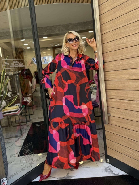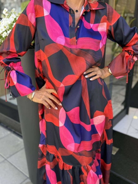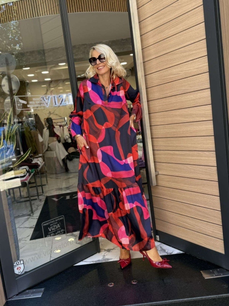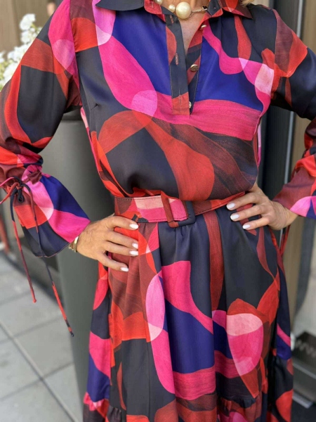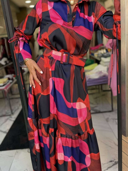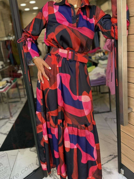 Рокля с огнен десен от сатенирана материя. Моделът е със свободна кройка и има колан за вталяване към нея.