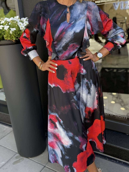 Рокля с миди дължина с цветен десен. Моделът е с рязана талия и долната част е тип клош. Закопчава се с цип.