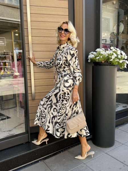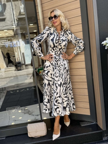 Рокля с миди дължина в черно и екрю с лек блясък в материята. Моделът има цип и копчета, странични джобове и колан за талията.