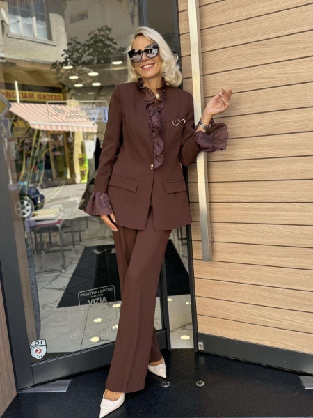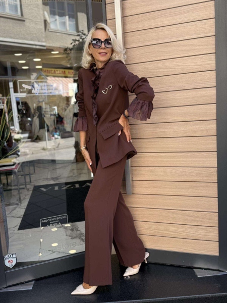 Комплект сако и панталон в кафяв цвят. Сакото е свободно без вталяване, с декорация от харбала на ръкавите и реверите. Панталонът е със свободни крачоли с ръб. Закопчава се с цип и копче и има ластик на талията.