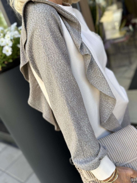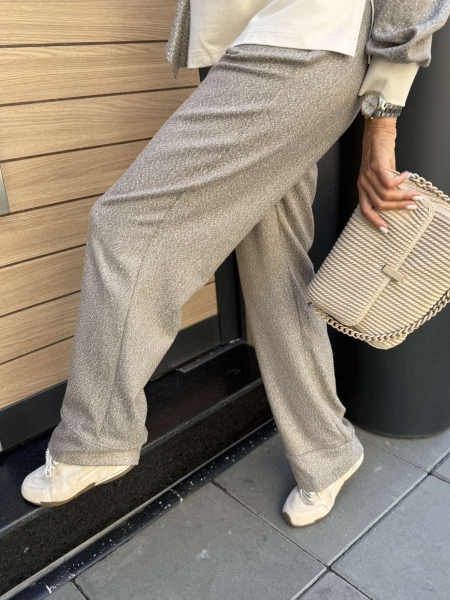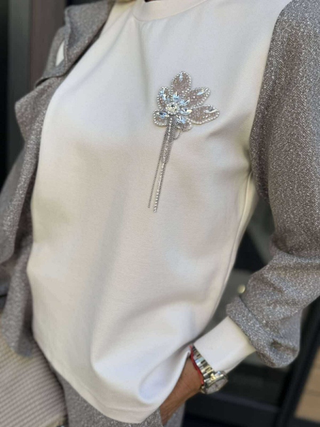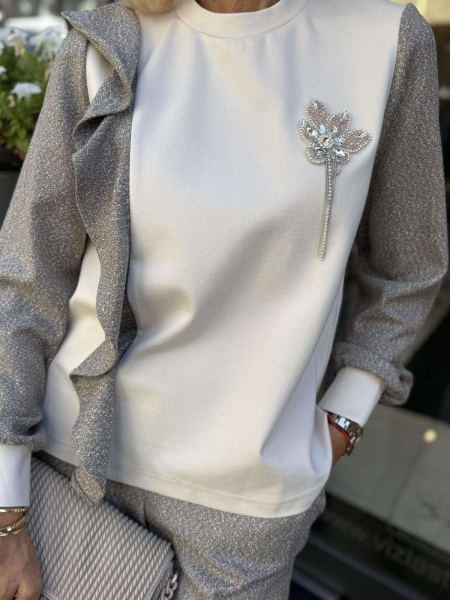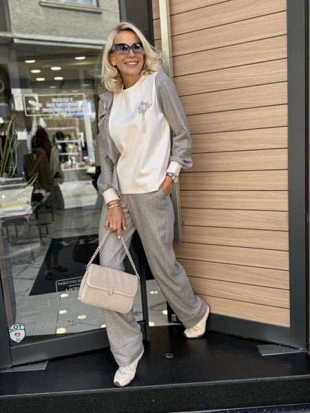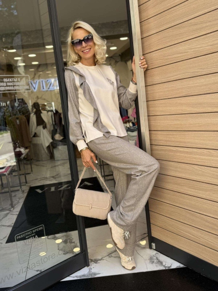 Комплект блуза и панталон в бежов цвят от трико и травир. Блузата е свободна с харбала от едната страна и декорация с камъчета от другата страна. Панталонът е със широки крачоли, ластик на талията и закопчаване с цип и копче.