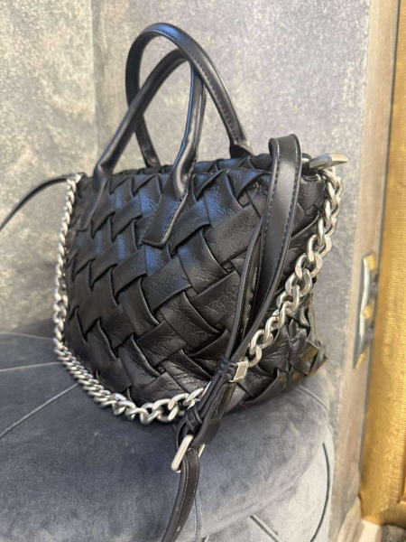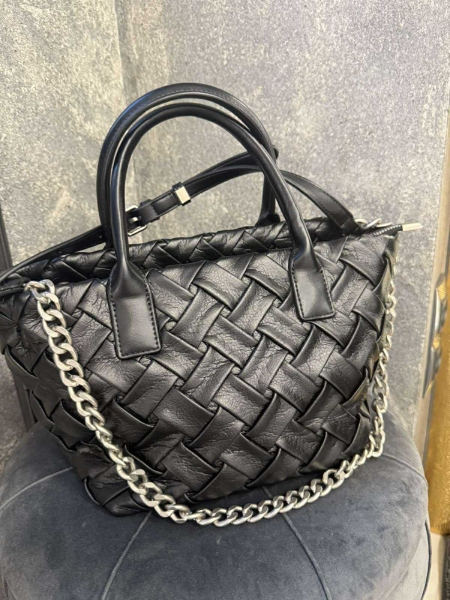 Малка чанта в черен цвят от еко кожа. Моделът е с къси дръжки и в допълнение има дълга, която се регулира. Едно отделение и закопчаване с метален цип.