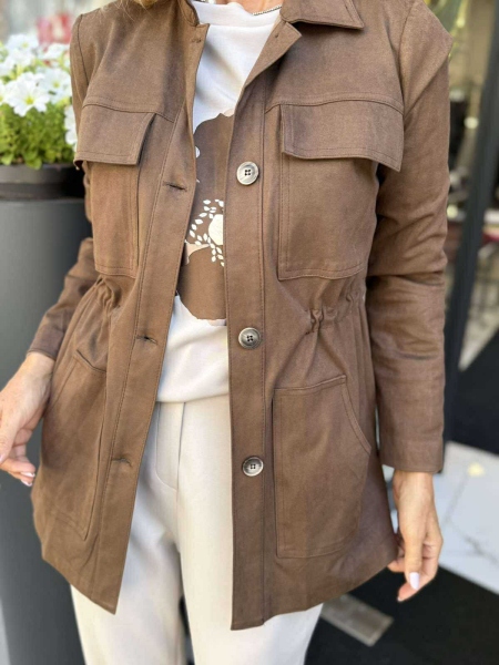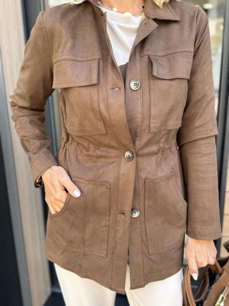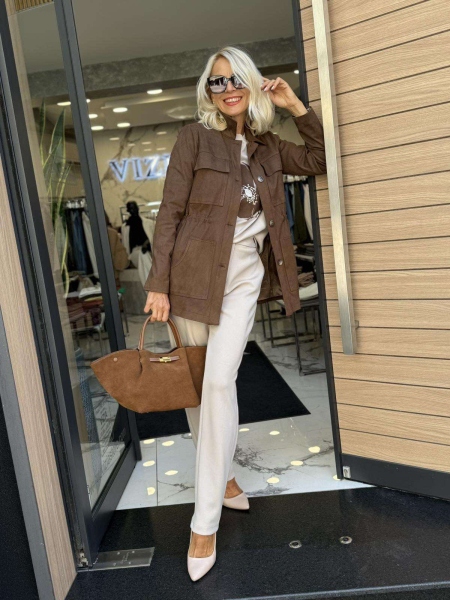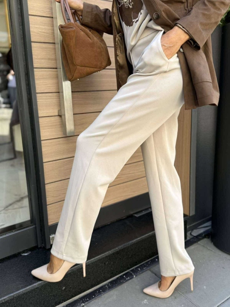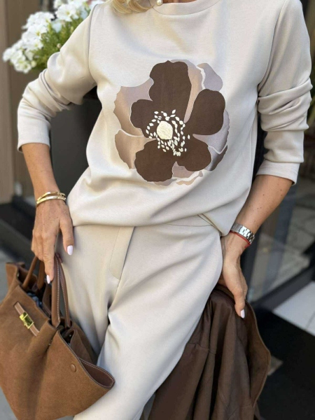 Комплект от три части в бежово и кафяво. Блуза от трико с декорация и права кройка. Панталонът е от трико с прави крачоли, застик на талията и закопчаване с цип и копче. Якето е тип тренч от еко велур с ластици на талията за вталяване.