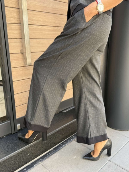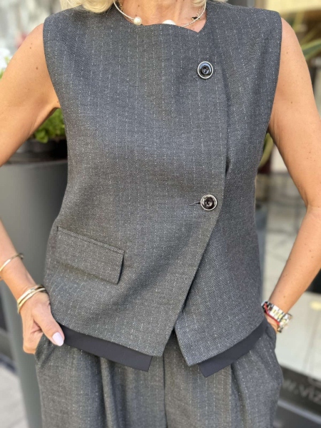 Комплект елек с панталон в тъмно сив цвят с раиран десен. Елекът е свободен и се закопчава с копчета. Панталонът е с широки крачоли с басти, ластик на талията и се закопчава с цип и копче. Към него има и колан.
