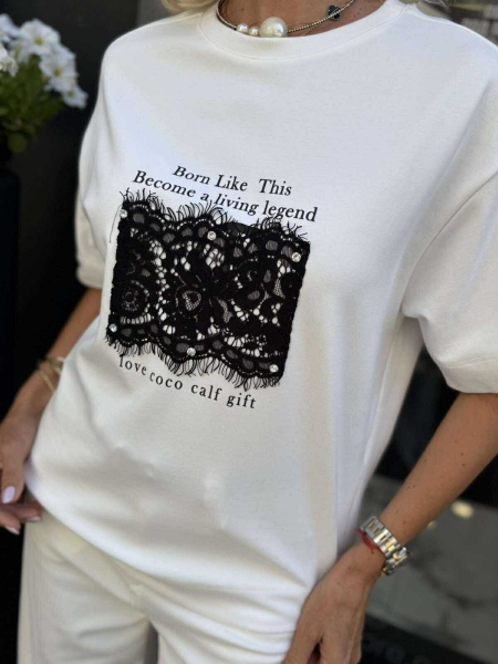 Тениска от трико в бял цвят със свободен силует и декорация в предната част.