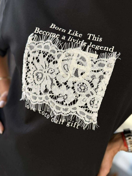 Тениска от трико в черен цвят със свободен силует и декорация в предната част.