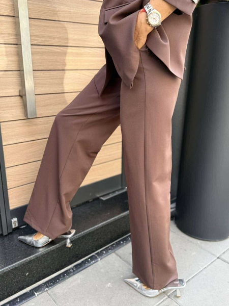 Комплект сако и панталон в кафяв цвят. Сакото е с права кройка. дантелен гръб и декорации по ръкавите. Панталонът е с прави, свободни крачоли, ластик на талията и закопчаване с цип и копче.