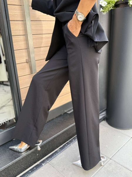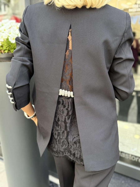 Комплект сако и панталон в черен цвят. Сакото е с права кройка. дантелен гръб и декорации по ръкавите. Панталонът е с прави, свободни крачоли, ластик на талията и закопчаване с цип и копче.