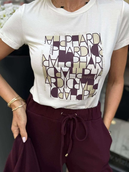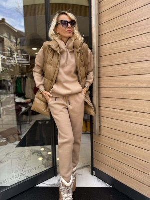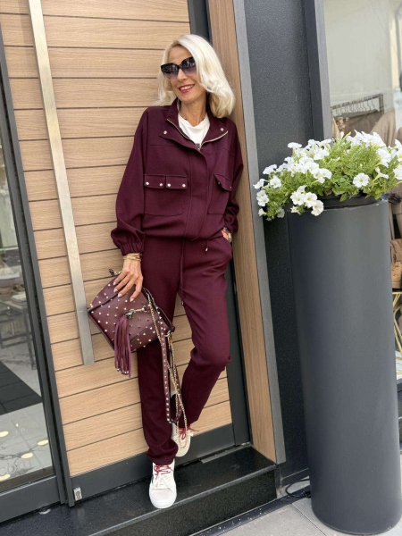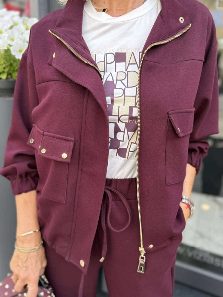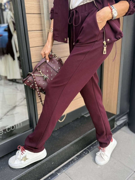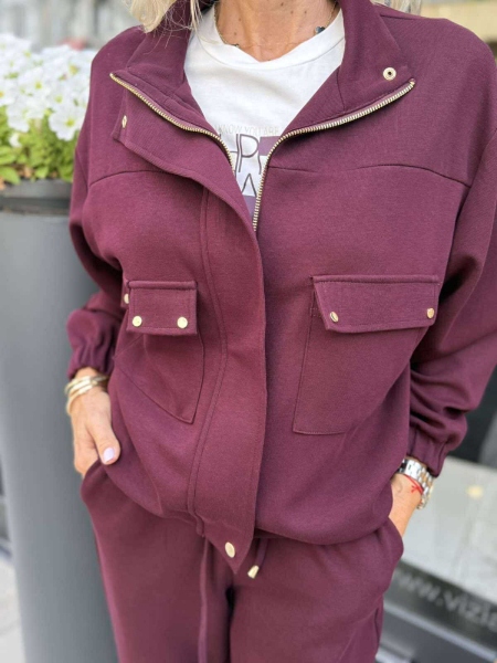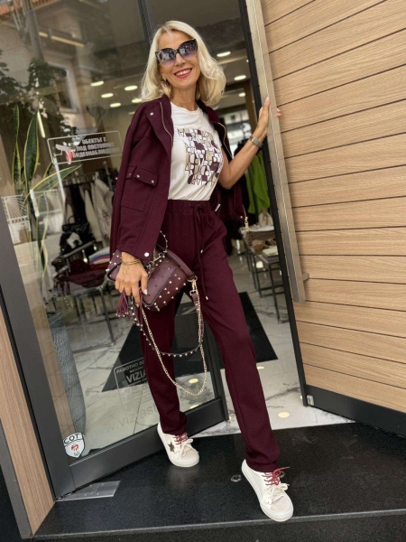 Комплект три части в цвят бордо от трико. Якето е тип бомбър със стопери в долната част за свиване. Блузата е свободна с декорация в предната част. Панталонът е с прави крачоли и ластик на талията.