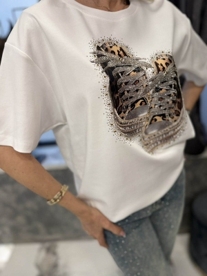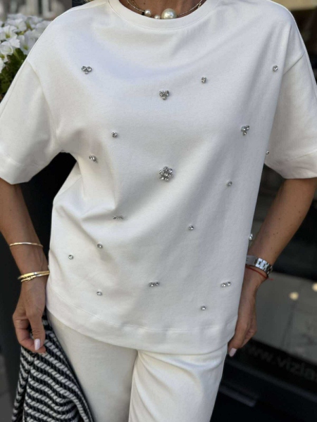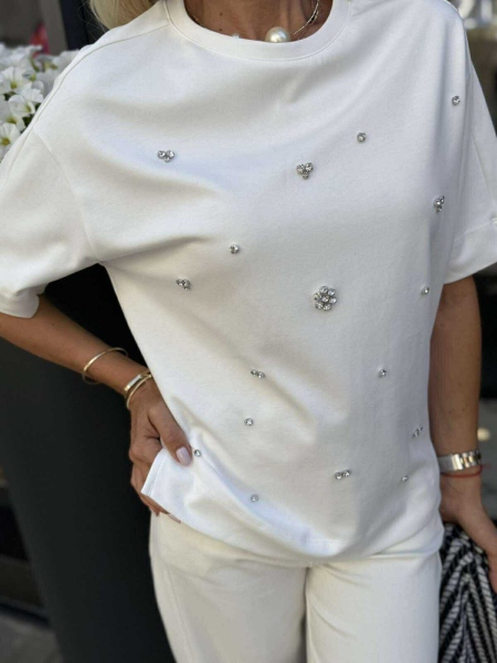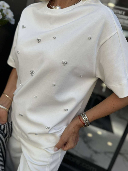 Блуза от трико в бял цвят със свободен силует и декорация от камъчета в предната част.