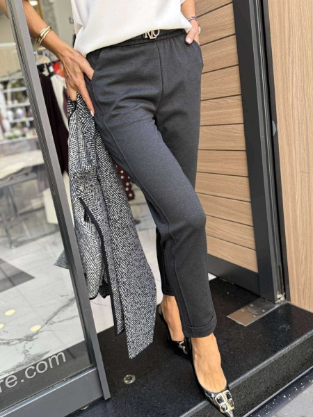 Панталон в тъмно сив цвят от плътна материя. Моделът е с ластик на талията и стесняващи се крачоли. Към него има и аксесоар колан.