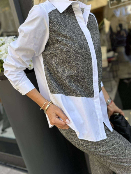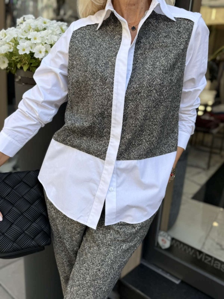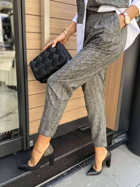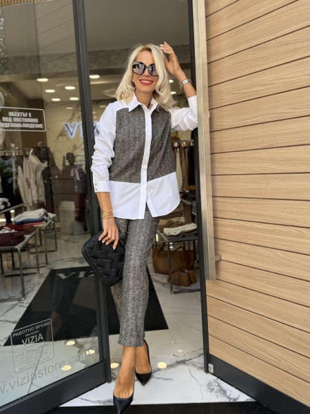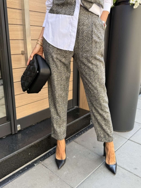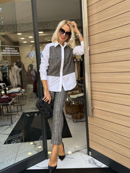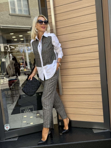 Комплект риза и панталон от наподобяваща на туид материя. Ризата е със свободна кройка. Панталонът е със стесняващи се крачоли и ластик на талията.
