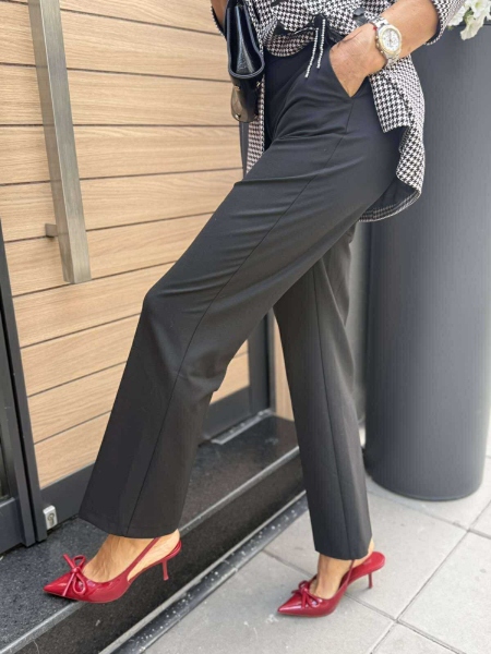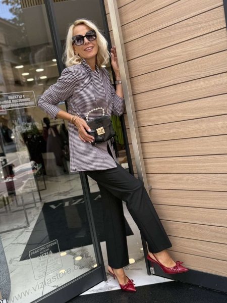 Комплект сако и панталон с аксесоар чантичка. Сакото е леко вталено с издължена кройка и закопчаване с копе. Панталонът е с прави крачоли с ръб, ластик на талията и закопчаване с цип и копче.