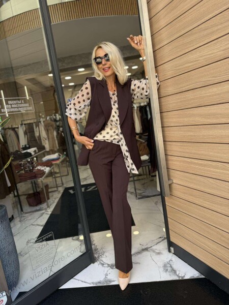 Комплект елек с панталон в тъмно кафяв цвят. Елекът е издължен с втален силует. Панталонът е лек чарлстон с ръб и закопчаване с цип и копче.