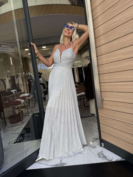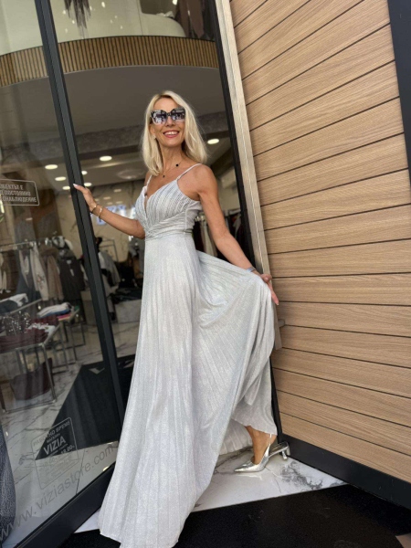 Дълга елегантна рокля  в сребрист цвят с бляскав ефект. Горната част е с твърди чашки и прозражен тюл. Долната част е солирана и пада свободно. Закопчаване с цип.