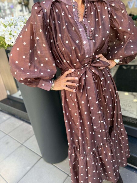 Дълга рокля със свободна кройка в кафяво на точки. Моделът се закопчава с копчета, подвижна подплата и текстилен колан за вталяване. Универсален размер подходящ за S, M.