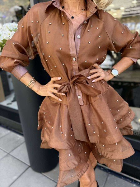 Къса рокля в цвят камел с декорация от камъчета. Моделът е с копчета и към нея има текстилен колан . Универсален размер подходящ за S, M.