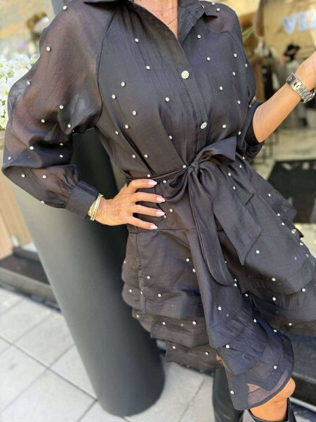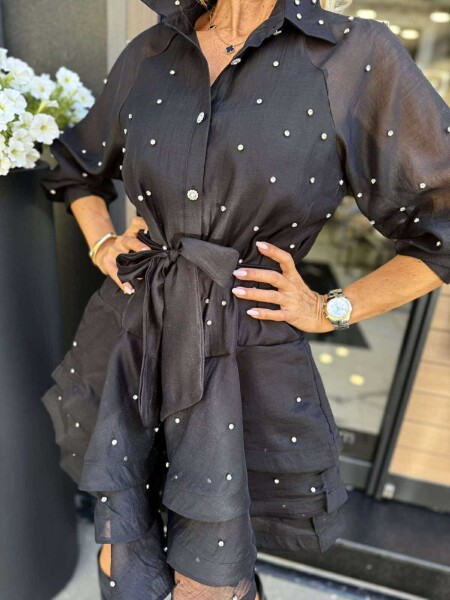 Къса рокля в черен цвят с декорация от камъчета. Моделът е с копчета и към нея има текстилен колан . Универсален размер подходящ за S, M.