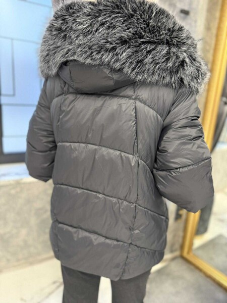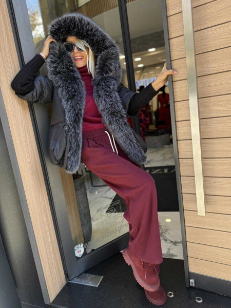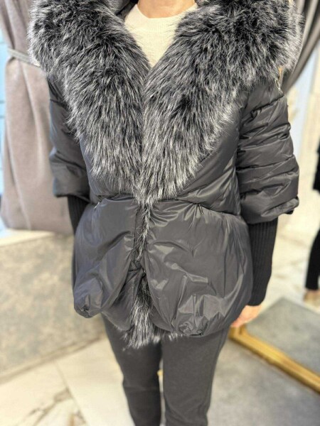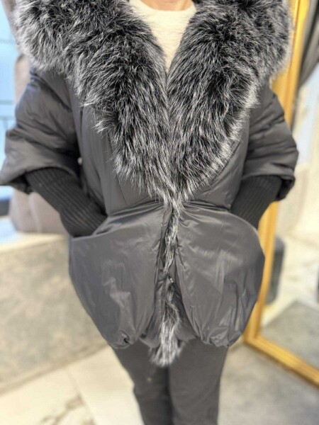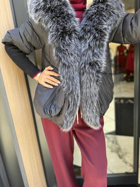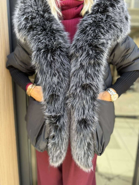 Яке в черен цвят от шушлякова материя с яка от еко косъм. Моделът е леко трапецовиден, има качулка и се закопчава сако с копчета. Ръкавите до половината са от плетиво. Яката е с възможност за сваляне.