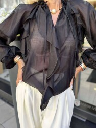 Късо яке от еко кожа в черен цвят с декорация от еко косъм в черен цвят цвят. Моделът е подплатен с мека подплата и се закопчава с копчета.