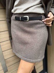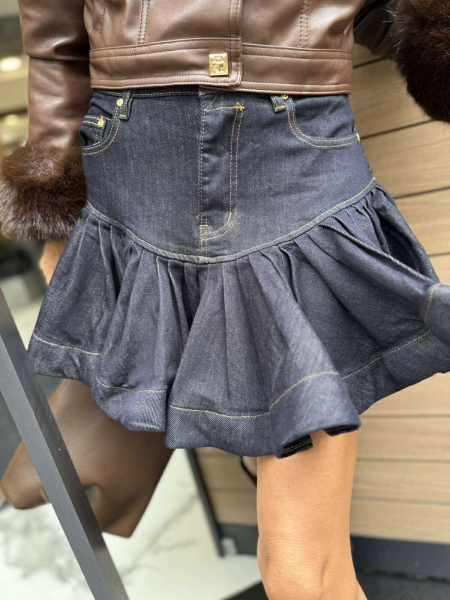 Къса дънкова пола от еластичен деним с голяма харбала. Моделът се закопчава с цип и копче.