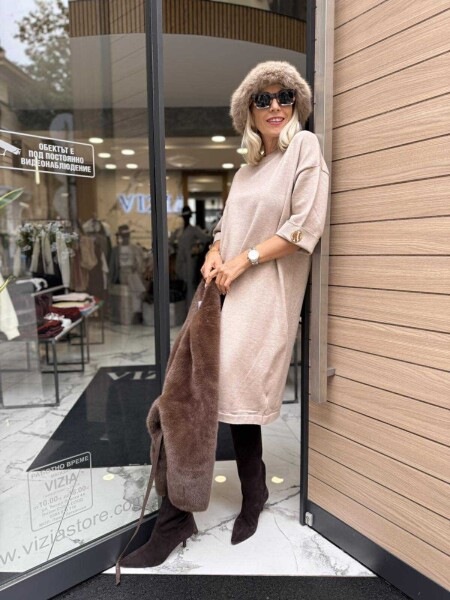 Рокля от фино плетиво в бежов цвят със свободна кройка. Моделът е универсален размер подходящ за M, L, XL.