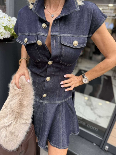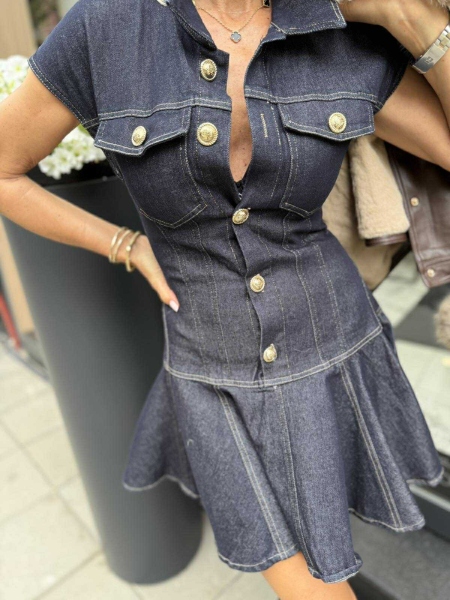 Къса рокля от тъмен деним с втален силует. Моделът е с голяма харбала и се закопчава с копчета.